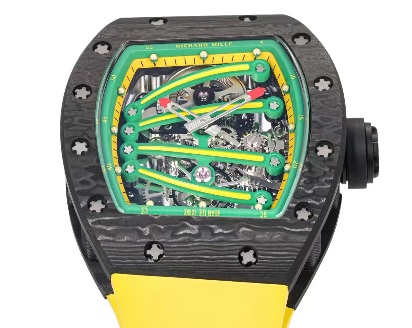Đặt mua ĐỒNG HỒ RICHARD MILLE RM59-01 REPLICA VỎ CARBON ĐEN MẶT XANH LẠ DÂY CAO SU VÀNG TOURBILLON 43x50xMM