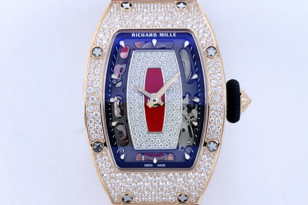RICHARD MILLE RM07-01 IMITATION LUXURY WATCHES RHINESTONE ROSE GOLD PLATE CASE RED DIAL RUBBER STRAP ZF FACTORY 36MM