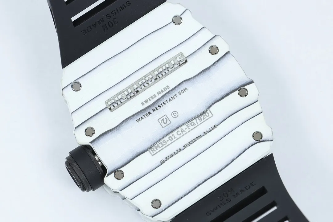 RICHARD MILLE RM35-01 LUXURY REPLICA WATCHES WHITE CARBON CASE BLACK RUBBER STRAP AUTOMATIC ZF FACTORY 49.9mm x 43mm