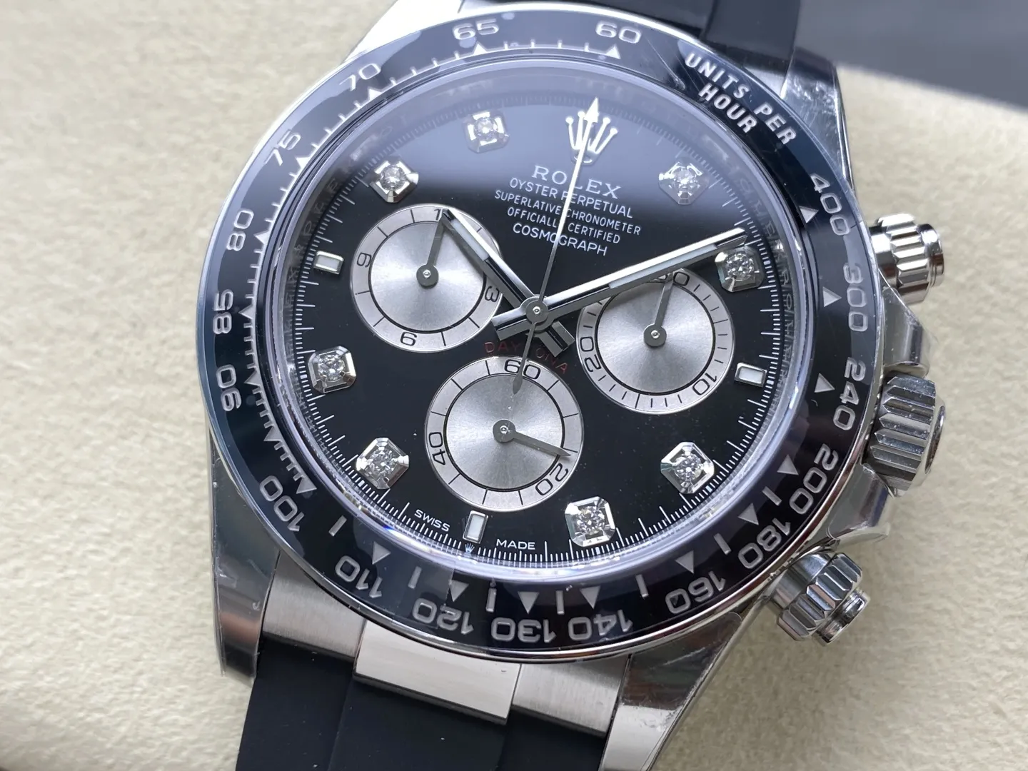 Đặt mua ROLEX DAYTONA COSMOGRAPH M126519LN-0004 KNOCK OFF WATCHES BLACK DIAL RHINESTONE HOURS OYSTERFLEX STRAP VS FACTORY 40MM